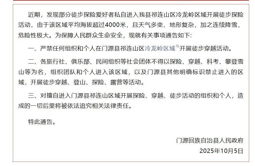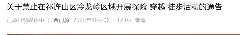 10月5日,门源回族自治县人民政府发布关于禁止在祁连山区冷龙岭区域开展探险 穿越 徒步活动的通告,内容如下: