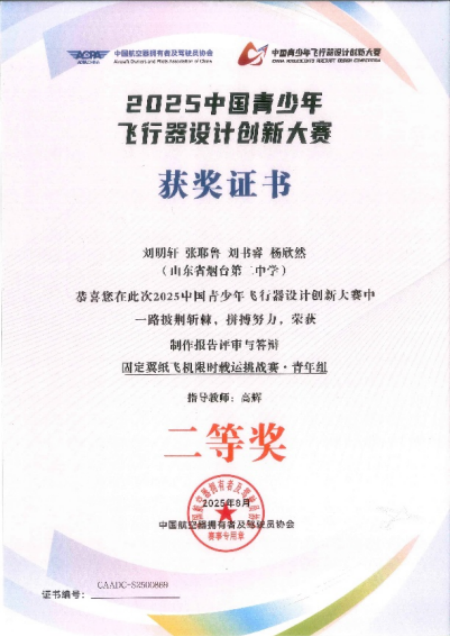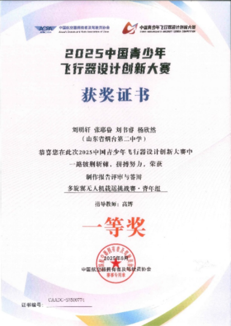 胶东在线消息(通讯员 郐雅跃 实习编辑 单煜媛)2025中国青少年飞行器设计创新大赛总决赛在浙江莫干山通用机场举行。山东省烟台第二中学代表队队员刘明轩、张耶鲁、刘书睿、杨欣然,在指导老师高辉的带领下,凭借出色发挥,从全国400余名青少年选手中脱颖而出,荣获“多旋翼无人机载运挑战赛”报告及答辩全国一等奖,挑战赛全国三等奖;荣获“固定翼纸飞机限时载运挑战赛”报告及答辩全国二等奖,挑战赛全国三等奖。