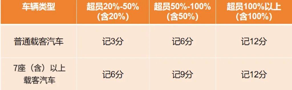 根据《道路交通安全违法行为记分管理办法》规定,车辆超员处罚详细的划分标准: