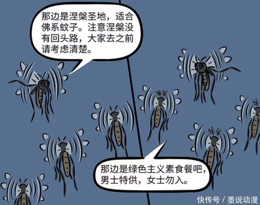 《非人哉》漫画版,蚊子可以说是出场次数比较多的普通生物。其中有一些蚊子,吸食过紫微大帝的血液,可是因为无法承受紫微大帝血液带来的能量,最终爆体而亡。至于观音家,那就是蚊子不夜城,还分好几个区域,当然有个区域,那是禁区,蚊子接待员表示不能去。