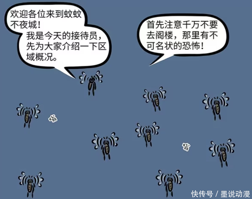 随着时代发展,蚊子们的娱乐活动也是越来越多。观音家成了蚊子不夜城,这里还有蚊子接待员。那么这个接待员主要是干什么的?它负责介绍每一个区域的情况。蚊子接待员最先提到的是阁楼,这里有不可名状的恐怖。所谓的不可名状恐怖,其实就是白泽,因为他的被动能力,可以让百兽战栗,蚊子一旦见到他,就会不自觉害怕,所以阁楼是禁区。